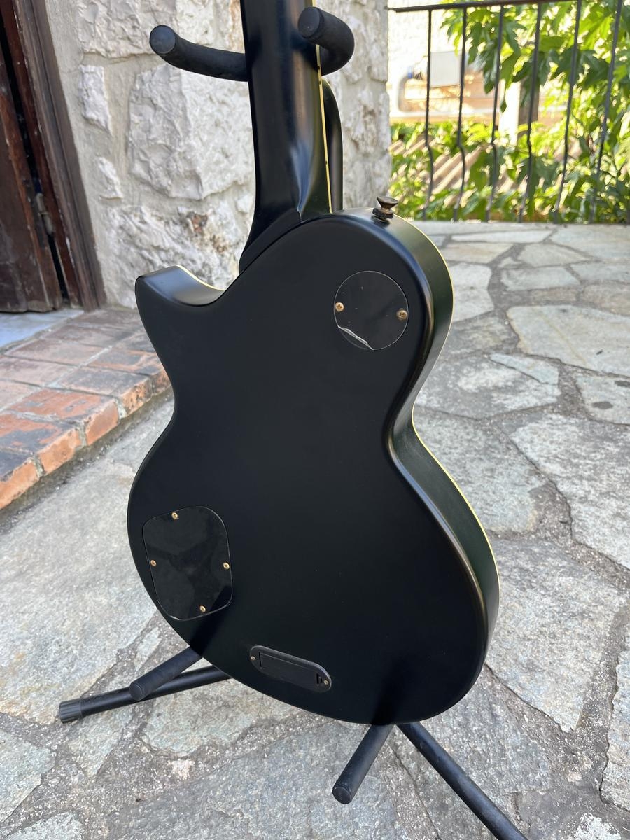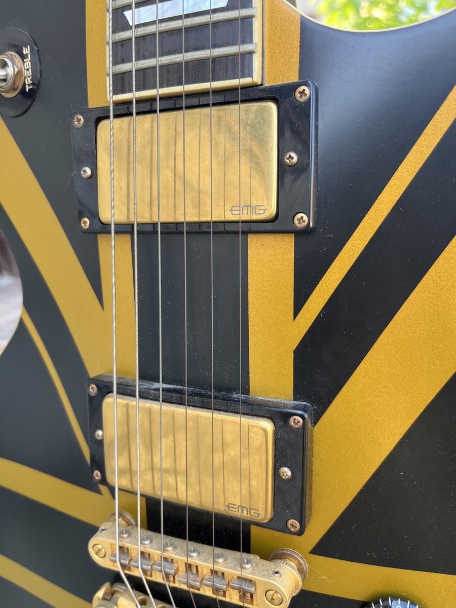 Cette guitare solidbody incarne un design audacieux et une qualité sonore robuste. Son corps épouse la forme classique Les Paul, embellie d’un graphique Union Jack en noir et jaune, pour un look qui ne passe pas inaperçu. Les micros actifs EMG renforcent la clarté et la puissance du signal, idéal pour les styles de musique demandant une présence marquée.