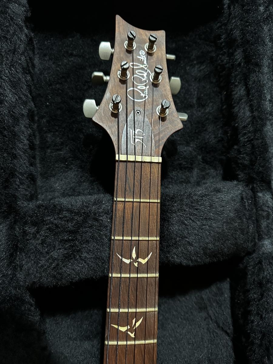 Table en érable 10 sculpté, corps en acajou à double pan coupé, manche en palissandre, touche en palissandre à rayon de 10", vibrato PRS et diapasons à verrouillage ñow-mass. Profil de manche 513, incrustations 513.
