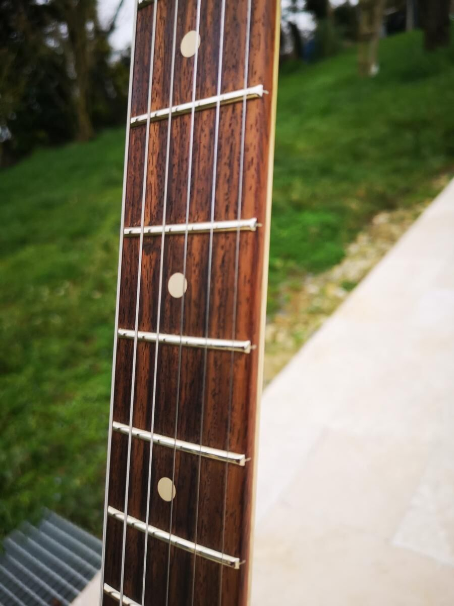 Je ne m'en suis servi occasionnellement que chez moi dans mon studio, elle est en trés bel état, pas de rayures, frettes nikel, bref comme neuve.
