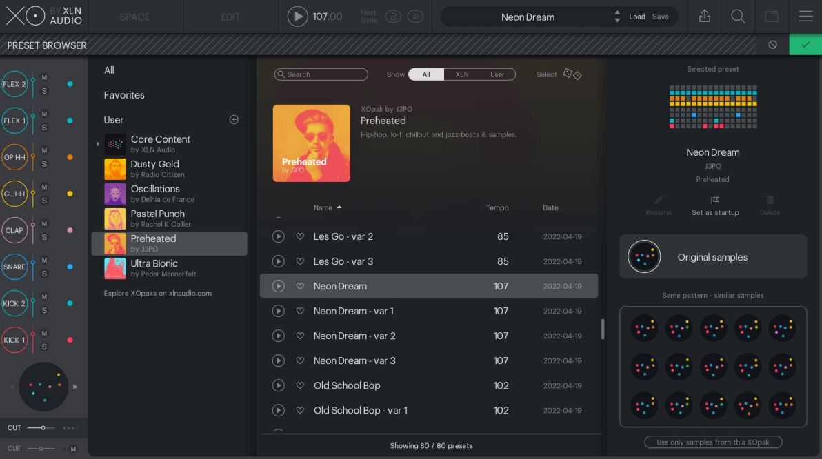 De la bonne musique Nu Jazz aux breaks au son old school en passant par des incursions occasionnelles dans la house, avec cette extension XO, J3PO nous offre de nombreuses manières de se mettre dans le groove. Peu importe ce que vous prévoyez de produire, que ce soit de la soul et du jazz, du hip-hop, du lo-fi, voire quelque chose de plus expérimental, vous trouverez ici quelque chose de parfait pour vous lancer. Réchauffez-vous avec des rythmes et des breaks endiablés, des accords rapides, des souffles lo-fi et des craquements. Donnez à vos morceaux un départ turbo en les lançant avec l'un des collaborateurs studio les plus en vogue du monde, J3PO. Des contretemps hip-hop croustillants et croquants aux progressions d'accords jazzy, des échantillons soulful et doux aux textures et aux notes de basse percutantes, cette extension XO contient tous les ingrédients pour vous lancer dans une multitude de directions différentes. Vous pourriez passer des heures à fouiller parmi un million d'échantillons et essayer de les organiser de manière à ce qu'ils sonnent juste... mais pourquoi ne pas laisser J3PO vous donner un coup de main et vous mette sur les rails avec l'un des 80 grooves qui font bouger, prêts à être utilisés dans le séquenceur rythmique intégré de XO. Une fois que vous avez trouvé celui que vous aimez, vous pouvez le personnaliser à votre guise : en modifiant les rythmes, en remplaçant chaque son par n'importe quel autre élément de la bibliothèque d'échantillons de XO - le tout parfaitement organisé en fonction de la façon dont ils s'intègrent en tant que remplacement. C'est toute la puissance de XO, avec une petite touche supplémentaire de J3PO.