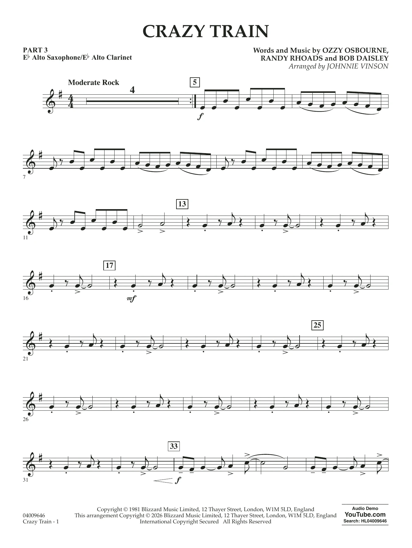 Crazy Train (arr. Johnnie Vinson) - Pt.3 - Eb Alto Sax/Alto Clar.