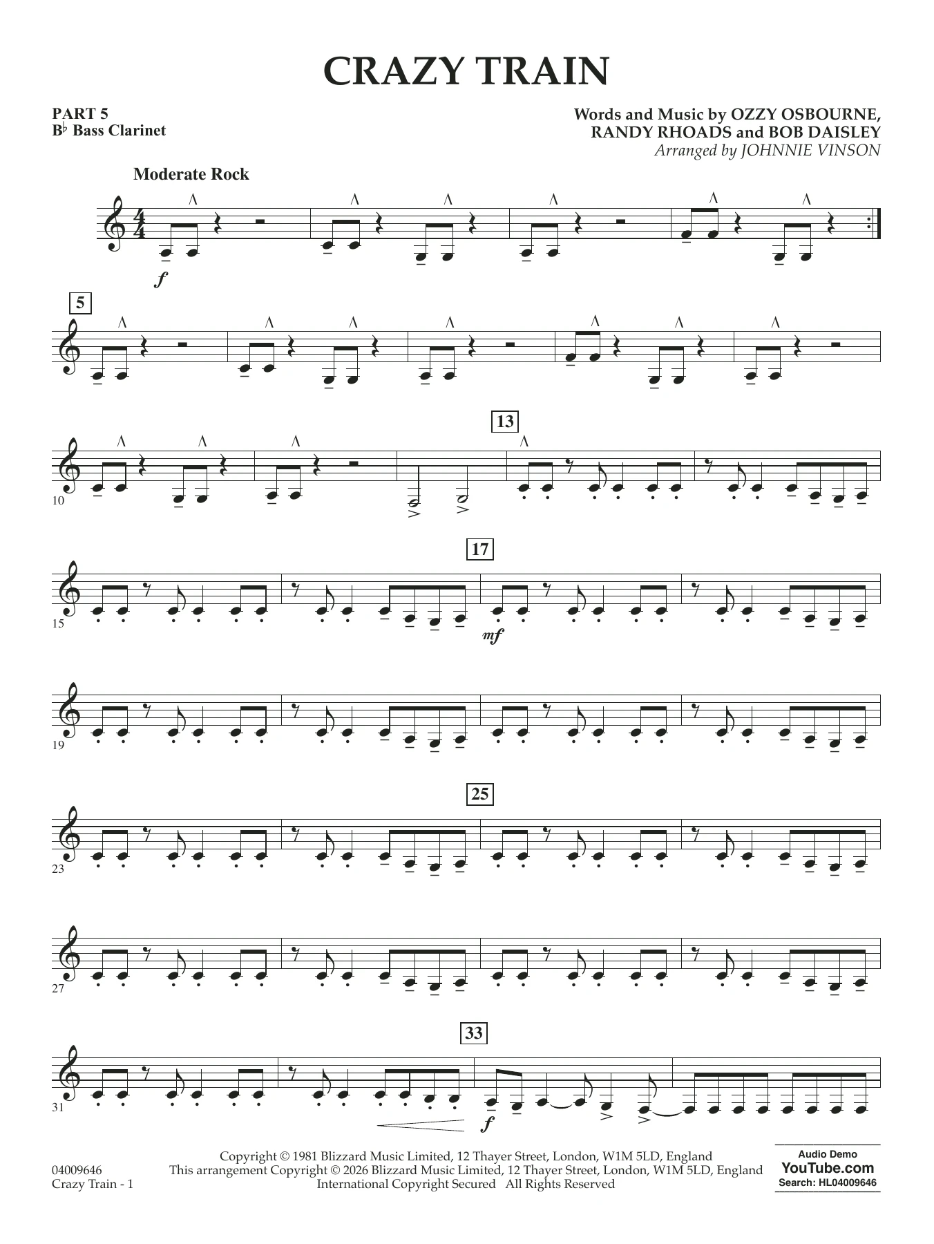 Crazy Train (arr. Johnnie Vinson) - Pt.5 - Bb Bass Clarinet