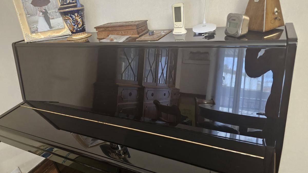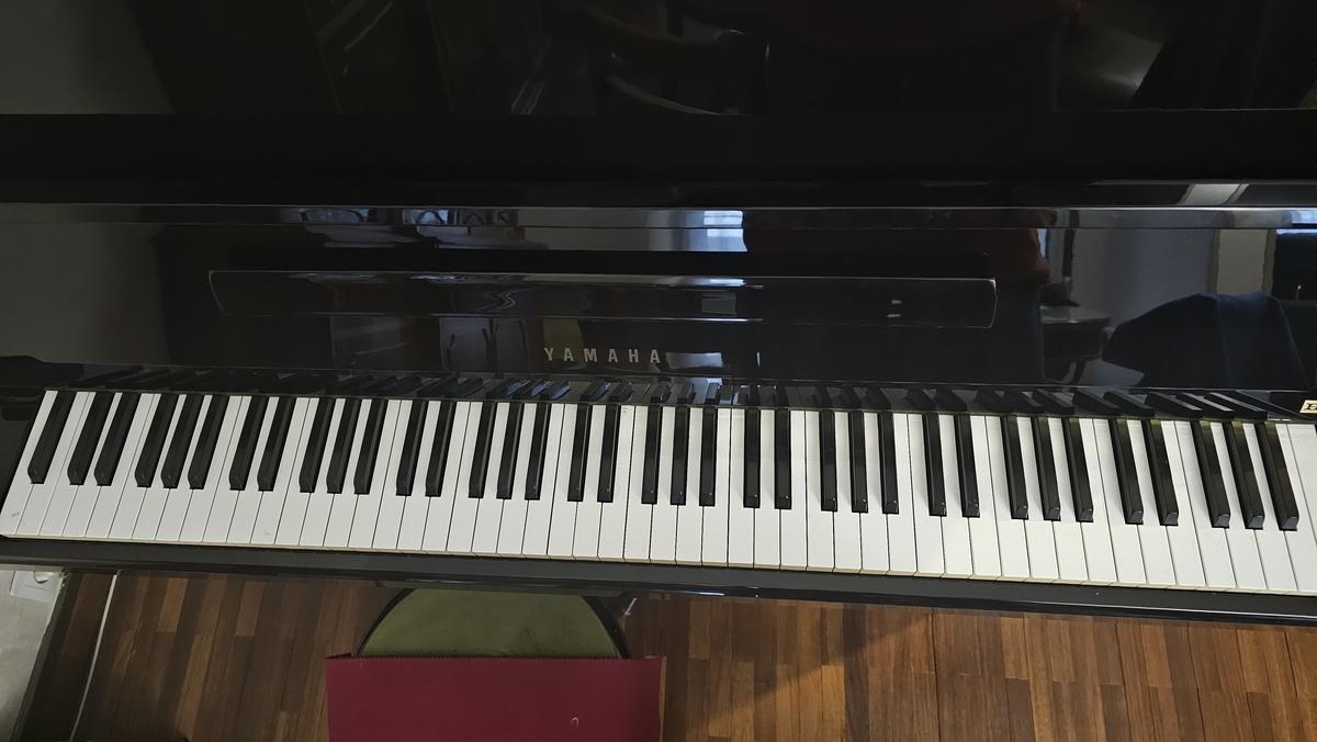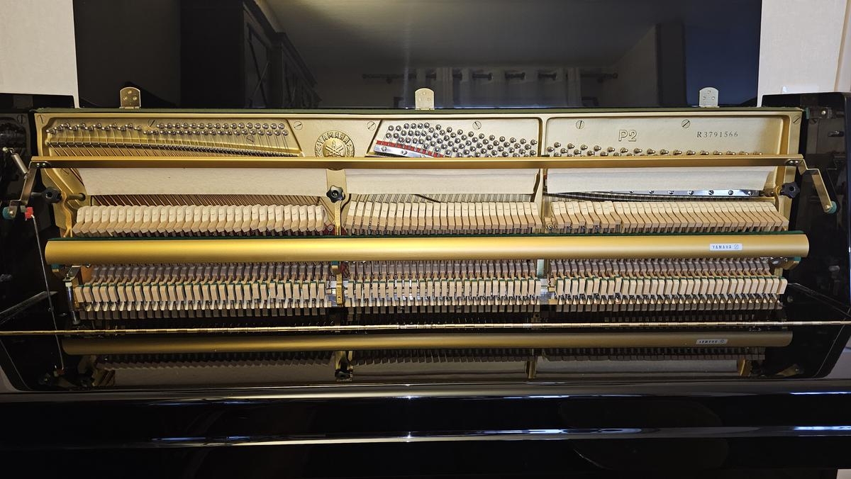 Piano droit Yamaha modèle P2J, n° 3.791.566. Excellent état, aucun coup sur le vernis ni rayures.