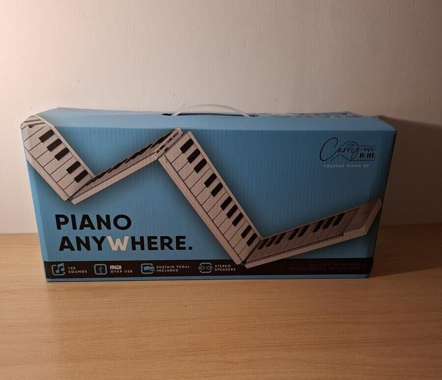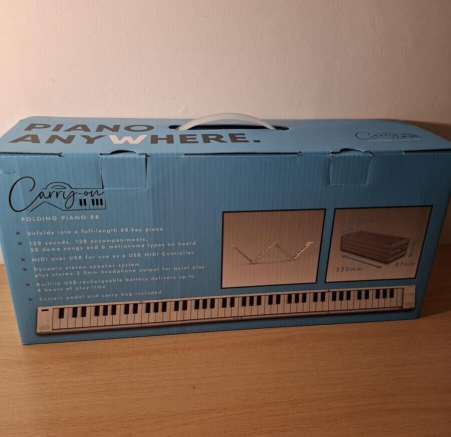 Le Carry-on Piano pliable 88 touches est un piano numérique ultra-compact et léger que l’on peut plier pour le glisser facilement dans un sac ou une valise. Avec ses 88 touches et son poids plume (environ 1,6 kg), il est idéal pour travailler son clavier partout, en voyage, en répétition ou à la maison, sans encombrement. Il se branche simplement en USB (sur un chargeur, un ordinateur ou une batterie externe) pour l’alimentation, et tu peux écouter le son au casque ou le relier à une enceinte, un ampli ou une table de mixage via la sortie audio avec un câble adapté. est un piano numérique ultra-compact et léger que l’on peut plier pour le glisser facilement dans un sac ou une valise. Avec ses 88 touches et son poids plume (environ 1,6 kg), il est idéal pour travailler son clavier partout, en voyage, en répétition ou à la maison, sans encombrement. Il se branche simplement en USB (sur un chargeur, un ordinateur ou une batterie externe) pour l’alimentation, et tu peux écouter le son au casque ou le relier à une enceinte, un ampli ou une table de mixage via la sortie audio avec un câble adapté.