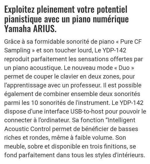 Le Yamaha Arius YDP-142 est un piano numérique conçu pour offrir une expérience de jeu authentique, idéale pour les débutants et les pianistes confirmés. Doté d’un toucher réaliste grâce au clavier Graded Hammer Standard (GHS), il reproduit fidèlement la sensation d’un piano acoustique en proposant une résistance progressive des touches (plus lourde dans les graves et plus légère dans les aigus). Son générateur de sons utilise la technologie Pure CF Sound Engine, basée sur l’échantillonnage du célèbre piano à queue Yamaha CFIIIS, pour un rendu sonore riche et expressif.Ce modèle est équipé de 10 sonorités, d’une polyphonie de 128 notes et de trois pédales avec fonction demi-pédale, permettant une grande expressivité dans l’interprétation. Son meuble élégant avec couvercle et ses haut-parleurs intégrés en font un instrument à la fois esthétique et performant, idéal pour une utilisation à domicile.Clavier : 88 touches, mécanique Graded Hammer Standard (GHS)Sonorités : 10 sons d’instruments, dont piano acoustique, électrique, orgue, clavecinPolyphonie : 128 notesAmplification : 2 haut-parleurs de 6W chacunEffets : Reverb, Damper ResonanceModes : Dual (superposition de sons), Duo (division du clavier pour jouer à deux)Pédales : 3 pédales (Sustain, Soft, Sostenuto) avec support du demi-pédaleMétronome intégré et enregistrement 2 pistesConnectique : Sortie casque, port USB-to-HostMeuble : Finition bois avec couvercle coulissant