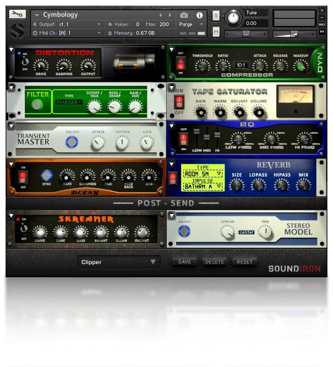 • Rack d'effets complet avec réverbération par convolution incluant des salles, halls, chambres et environnements FX personnalisés
