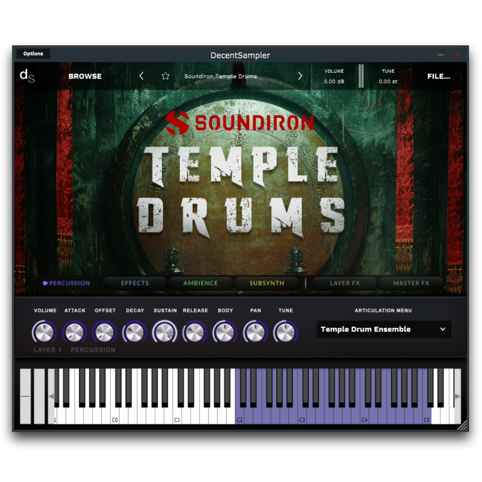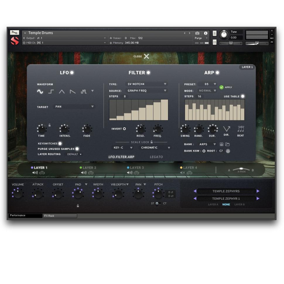 Temple Drums est une bibliothèque de percussions enregistrée dans une salle souterraine secrète en pierre. Nous avons enregistré une variété d'articulations de batterie et de cloches en solo à partir d'une position de micro proche et large afin de capturer un son précis, serré, brillant et luxuriant. La bibliothèque comprend une grosse caisse, un tom basse, des toms, des bongos, des caisses claires, un djembé, des doumbeks, un tambour sur cadre / bodhran, de grandes cymbales à main tibétaines, une cloche en cuivre tibétaine et un gong plat de 36 pouces. L'espace a une ambiance vive, lumineuse et luxuriante, et nous avons enregistré chaque instrument de près pour une clarté et une présence maximales, avec une image stéréo large.