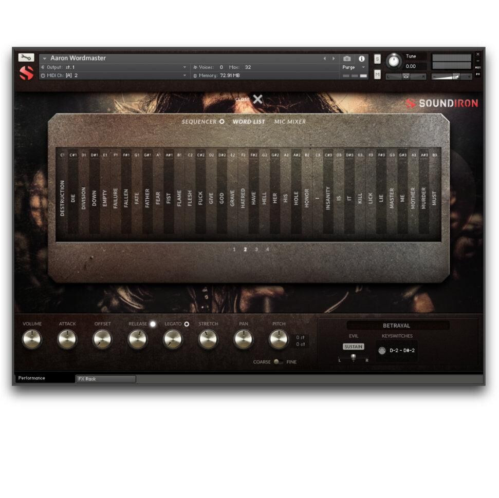 Nous avons enregistré les chanteurs Evan "Severed" Seidlitz, Alecia "Mixi" Demner (Stitched Up Heart), Jason Kocol (Impaled), Aaron Boynton (The Sky We Scrape) et Redouane Aouameur. Chaque chanteur apporte son propre style et sa propre technique unique, vous offrant ainsi la possibilité de travailler avec un large éventail de sous-genres du metal. Nous les avons poussés à leurs limites physiques absolues pour créer une vaste gamme de paroles entièrement jouables. L'immense dictionnaire Wordmaster comprend 100 mots, couvrant une variété de noms, pronoms, verbes et adjectifs. Chaque mot a été choisi pour créer une boîte à outils lyrique efficace, avec des variantes soutenues et staccato - à la fois dans les tons gutturaux de la mort et les tons acides criards. Nous avons également enregistré des centaines de micro-phrases en direct qui peuvent être assemblées dans vos propres chansons à l'aide de notre séquenceur de phrases et synchronisées au tempo, étirées, superposées et mélangées de toutes les manières possibles.