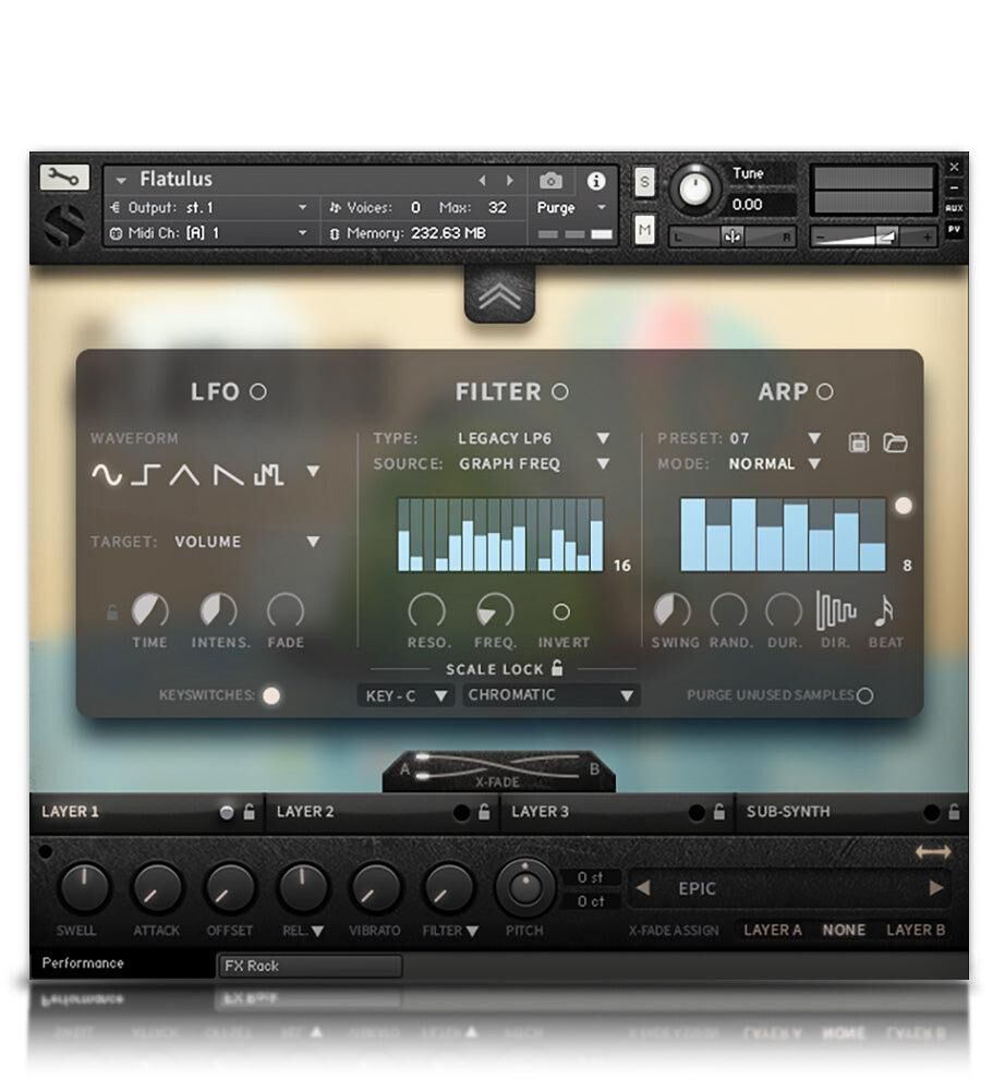 Cette bibliothèque est livrée avec un système LFO adaptable, avec la forme d'onde LFO sélectionnable, le paramètre de modulation cible, la vitesse, l'intensité, la synchronisation au tempo et le temps de fondu. Vous pouvez également appliquer votre choix parmi 12 filtres passe-bas, passe-haut et FX, avec des cibles de modulation assignables telles que la vélocité, la molette de modulation, l'expression, l'aftertouch, la position des touches et le contrôle du séquenceur pas à pas. Notre arpégiateur personnalisable offre une table de vélocité et un contrôle sur la direction de l'arpège, le timing, le swing, la randomisation et la durée. Nous avons ajouté un système de verrouillage de note et de gamme pour limiter vos notes à des gammes et des tonalités communes pour une composition mélodique et une performance en direct faciles.