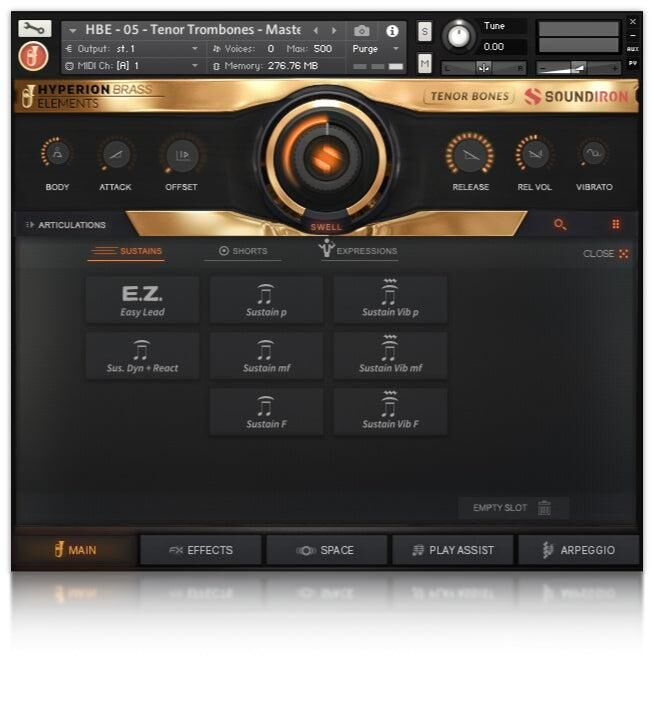 Hyperion Brass Elements comprend 10 préréglages d'ensemble combiné et 6 préréglages de section "Master" et "True-Legato" pour 6 trompettes, 4 trombones ténor, 4 cors français, 3 euphoniums, 3 trombones basse et 3 tubas. Les préréglages "Master" incluent une large sélection d'articulations fondamentales, chacune avec sa propre gamme d'options de performance en temps réel personnalisables, d'options de changement de touche et de mappage, ainsi que d'outils de performance. Ces préréglages "Master" vous permettent de mélanger et de passer facilement entre les tenues avec vibrato et sans vibrato, une variété de notes courtes et des expressions naturellement dynamiques basées sur le tempo.