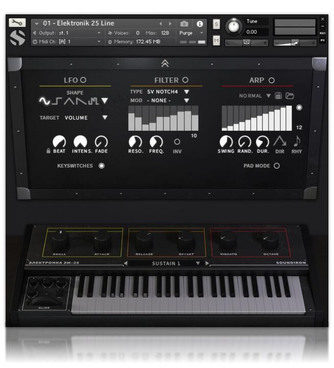 Elektronik 25 de Soundiron capture les sons rares et historiques du synthétiseur unique Elektronika EM-25. Ce synthétiseur a été fabriqué quelque part en Union soviétique et est devenu depuis un objet de collection. L'EM-25 est un synthétiseur polyphonique axé sur les cordes, l'orgue et les cuivres. Il possède un clavier de 4 octaves, ainsi qu'une variété de boutons pour contrôler l'enveloppe, la modulation et le filtre. Elektronik 25 propose des sustain, des staccatos et une collection de sons de pads FX. Nous avons enregistré les articulations de l'instrument en stéréo large et en ligne directe. Ensuite, nous avons créé plus de quarante pads atmosphériques évolutifs à partir du contenu source pour améliorer l'ergonomie. Elektronik 25 offre un aperçu rare des synthétiseurs de l'ère soviétique tant recherchés, et les riches sonorités de cordes peuvent enrichir toute composition.