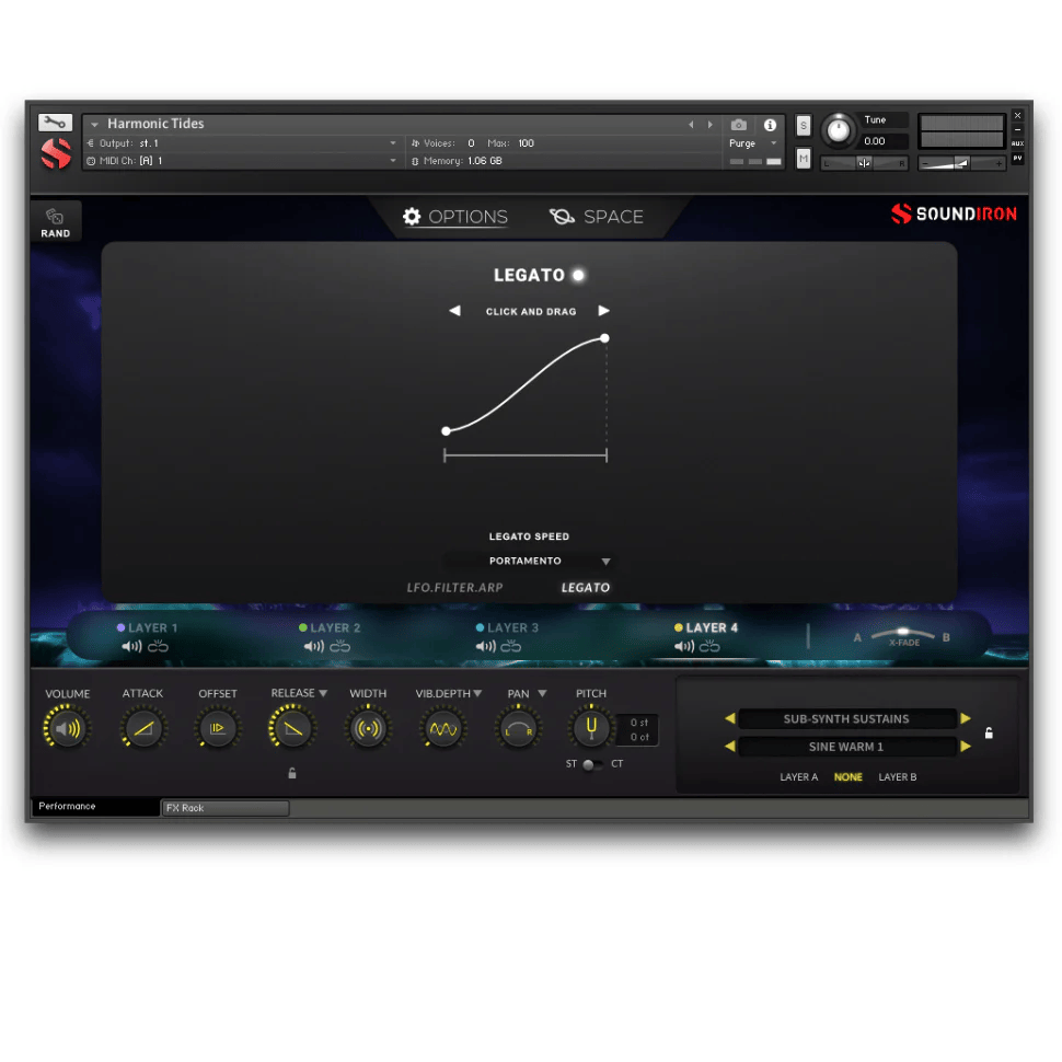 Harmonic Tides dispose de deux sources sonores principales. La première est une texture scintillante, délicate et aérienne, obtenue à partir de glissandi harmoniques de violoncelles superposés. Cette configuration est conçue pour ajouter un mouvement organique à la musique. Chaque touche est échantillonnée avec quatre niveaux de dynamique. La deuxième source sonore est un son net et creux, obtenu à partir d'échantillons superposés de l'archet joué entre le chevalet et la cordier d'une contrebasse. Ce son est conçu pour ajouter une tension subtile et un mouvement à la musique. Les deux ensembles d'articulations offrent une large gamme chromatique et dynamique, ce qui leur permet d'être joués de manière expressive en direct avec un clavier ou un autre contrôleur MIDI.