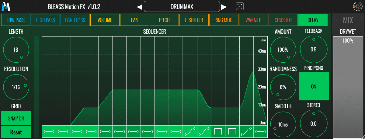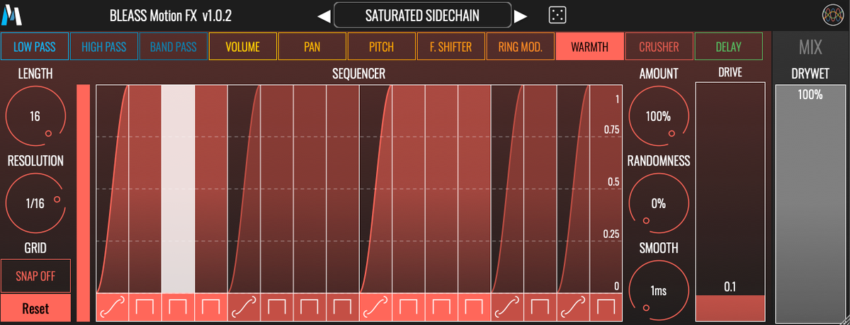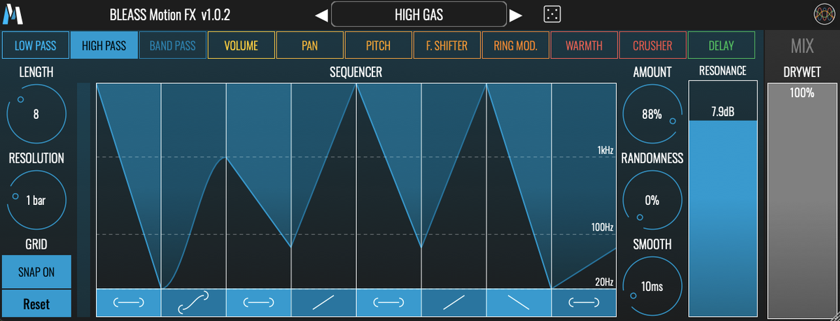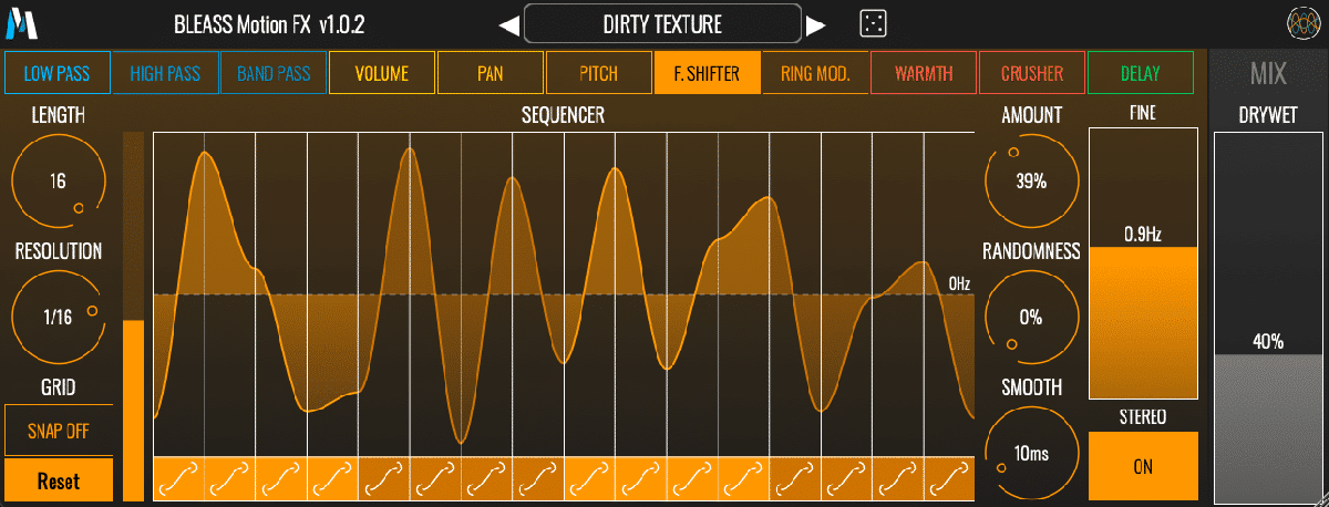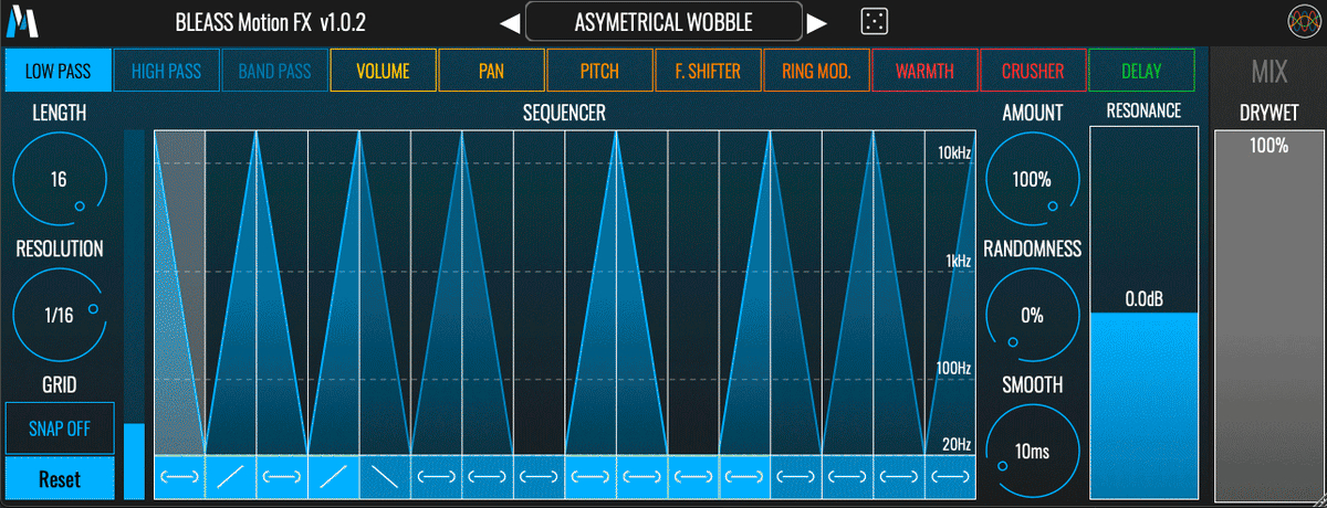 BLEASS Motion FX contient 11 effets différents que vous pouvez moduler avec précision grâce à un séquenceur intuitif et complet. Choisissez un effet et modulez-le dynamiquement grâce à un séquenceur de mouvement intuitif et polyvalent. Grâce à une utilisation CPU très faible, chargez autant d'instances de Motion FX que vous le souhaitez et découvrez de nouveaux territoires sonores ! Les effets inclus sont les suivants : - Filtre passe-bas - Filtre passe-haut - Filtre passe-bande - Volume - Balance - Pitch Shifter - Décaleur de fréquence - Modulateur en anneau - Chaleur - Bit Crusher - Délai Chaque effet possède un paramètre automatisé par le séquenceur et peut avoir un ou plusieurs paramètres secondaires. Choisissez un effet, puis modulez-le dynamiquement grâce au séquenceur de mouvement. Lorsque vous changez d'effet, le séquenceur de mouvement conserve son état pour vous inviter à de nouvelles idées de design sonore !