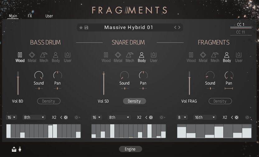 FRAGMENTS - MODERN PERCUSSION est un instrument de percussion construit à partir de sons qui ne se trouvent généralement pas dans une bibliothèque de percussions standard. Chaque son a été enregistré avec douze variations aléatoires et jusqu'à cinq couches de vélocité, avec un moteur d'effets et de randomisation qui donne une sensation vraiment humaine (littéralement, puisque nous avons même utilisé des parties du corps humain!).