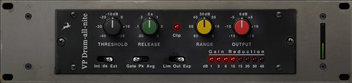 Placez le VP Drum-All-Nite dans une chaîne parallèle si vous souhaitez mettre en valeur le corps de la batterie. Expérimentez avec le limiteur en mode Peak ou Avg. pour obtenir le son désiré. Ce plugin permettra à votre batterie de percer le mur le plus fort de son de guitare tout en restant massive. Grâce aux modes Gate & Expander, en particulier lorsqu'ils sont utilisés simultanément, VP Drum-All-Nite peut resserrer votre mixage de batterie global tout en conservant son punch et son éclat caractéristiques.