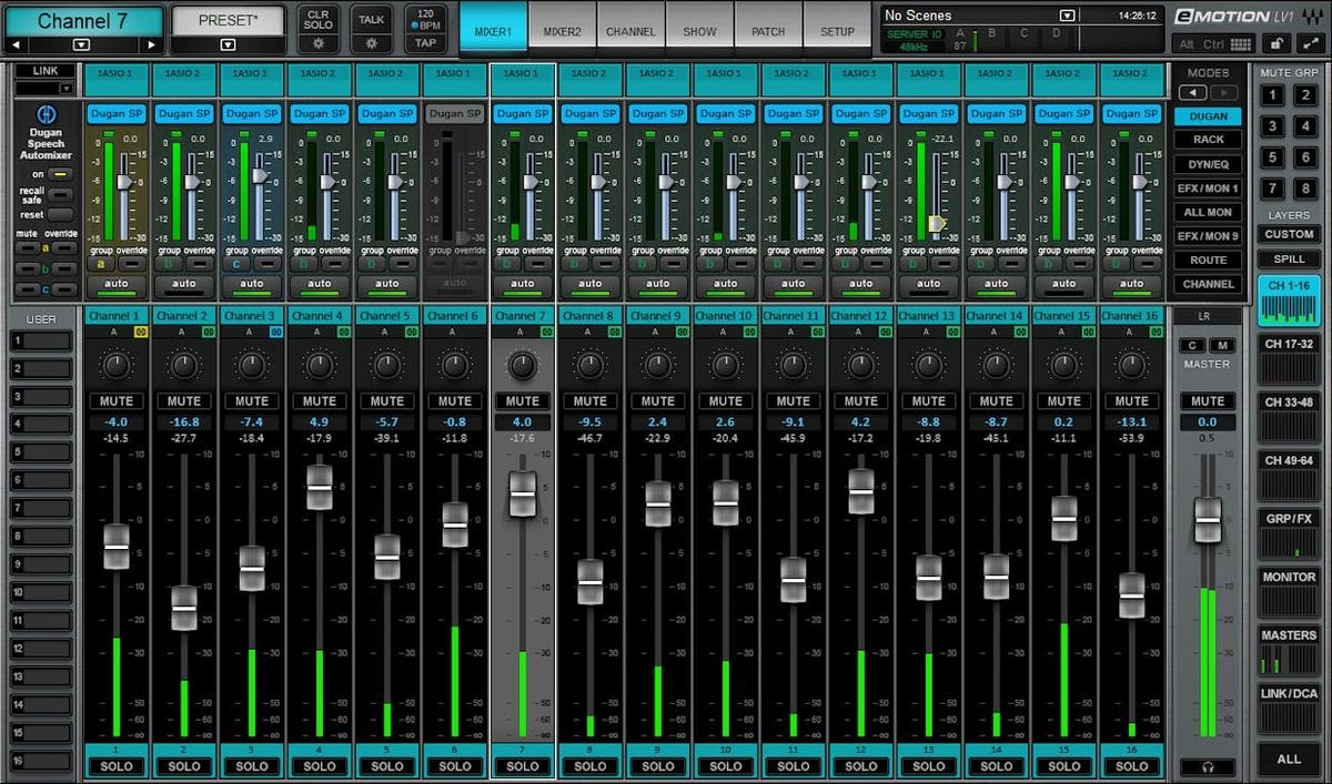 Version logicielle du Dugan automixer pour le contrôle automatique du gain de multiples micros, conçue pour une utilisation intégrée à l'intérieur de la console de mixage live eMotion LV1.