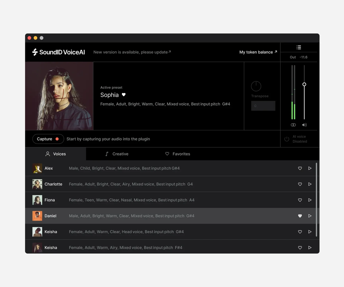 SoundID VoiceAI est le plugin de transformation vocale innovant conçu pour votre station audionumérique (DAW), vous permettant de changer facilement une voix chantée enregistrée en celle d'une autre personne grâce à la technologie AI. Avec cet outil, transformez n'importe quelle piste vocale en un enregistrement de qualité studio, presque indépendamment des conditions d'enregistrement d'origine. Il suffit d'ouvrir le plugin dans votre DAW, de capturer la piste vocale et de choisir parmi une bibliothèque de modèles vocaux AI de qualité studio pour créer une transformation vocale réaliste et humaine.