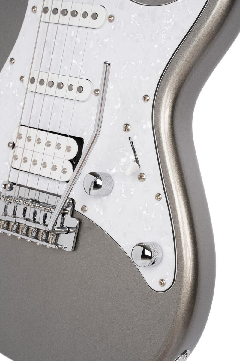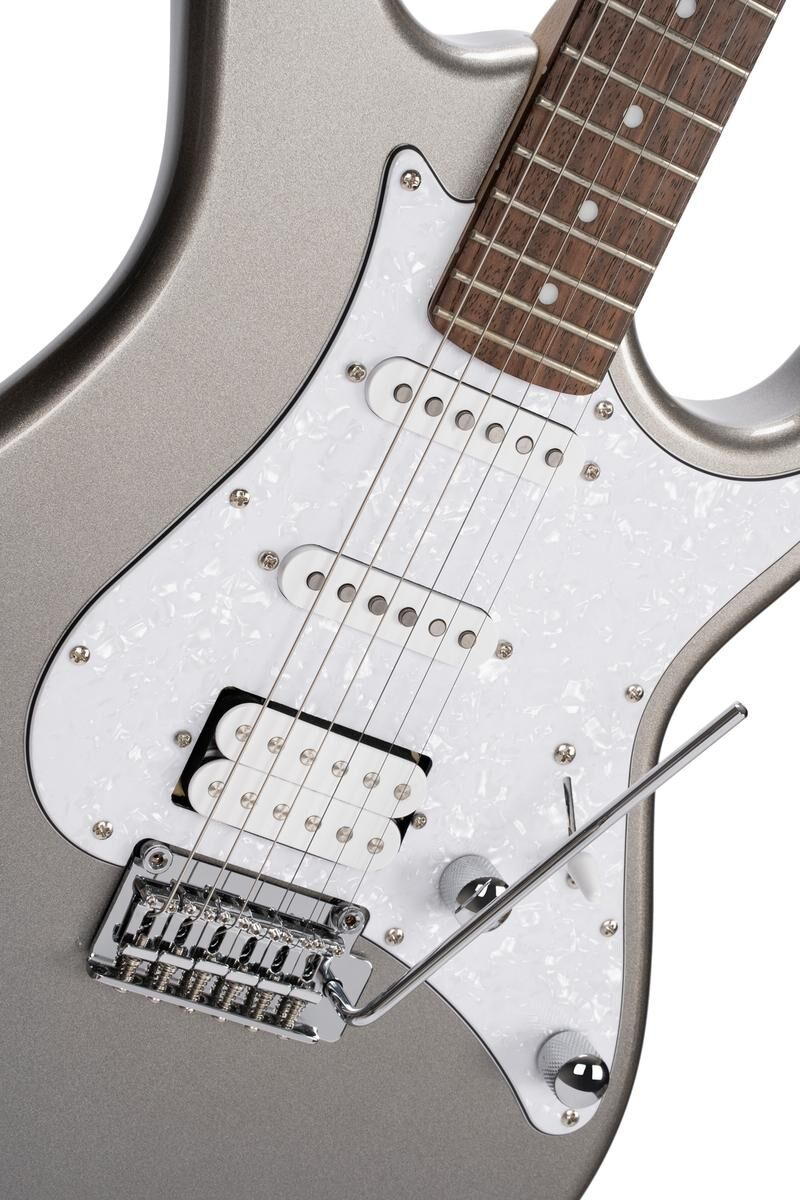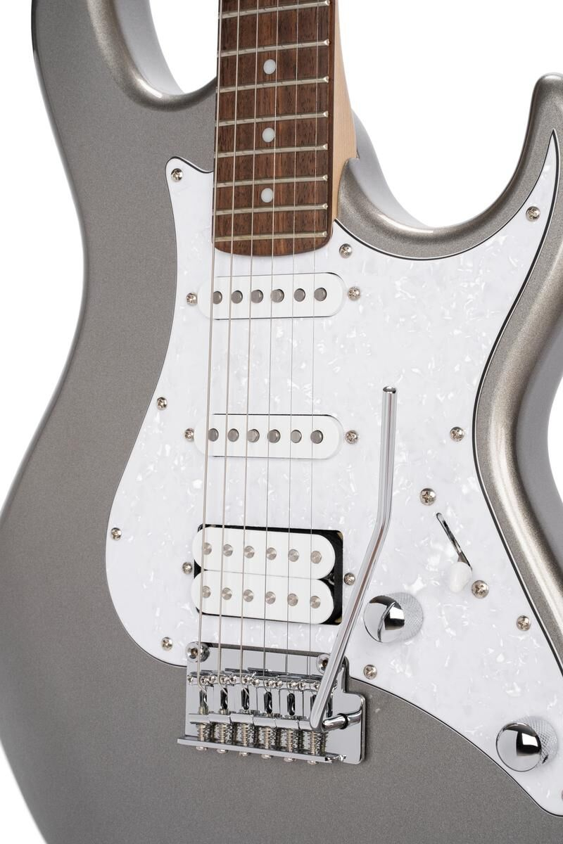 La Cort G250 en finition argent métallisé allie design moderne et caractéristiques classiques, idéale pour les guitaristes débutants comme pour les amateurs avancés. Son corps en tilleul léger et résonant, associé à un manche en érable et une touche en jatoba, offre une jouabilité agréable et une sonorité riche. Avec un sillet de 42 mm et 22 frettes, cette guitare permet une grande précision dans le jeu.
