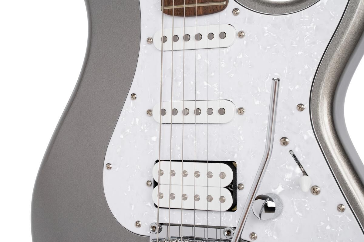 Équipée d’un micro double et de deux micros simples Cort Alnico V, elle offre une palette sonore variée, adaptée à différents styles musicaux. Le système de contrôle comprend un volume, une tonalité avec fonction coil-tap, et un sélecteur à 5 positions, permettant de moduler facilement le son. Son trémolo chromé et sa plaque blanche nacrée apportent une touche esthétique élégante, tandis que l’accastillage chromé assure une durabilité optimale. Les cordes D'Addario EXL-120 (9-42) garantissent une excellente tenue et un son clair.