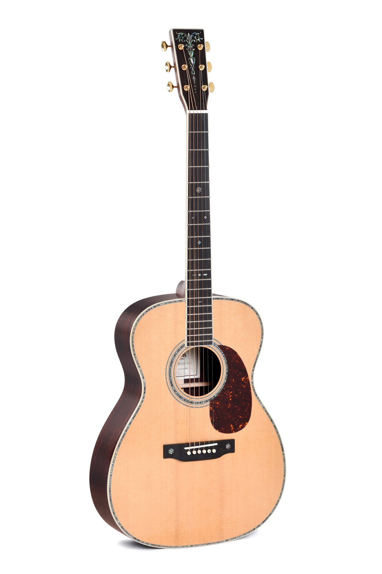 Modèle S000R-41SP, série Custom, forme 000, jonction à la 14ème frette, table en épicéa Sitka massif, fond et éclisses en palissandre indien massif, manche en acajou, sillets en os, touche en ébène, diapason de 25.4" (645 mm), largeur au sillet de 44.5 mm, mécaniques ouvertes Grover dorées, avec soft case SSC-OM.