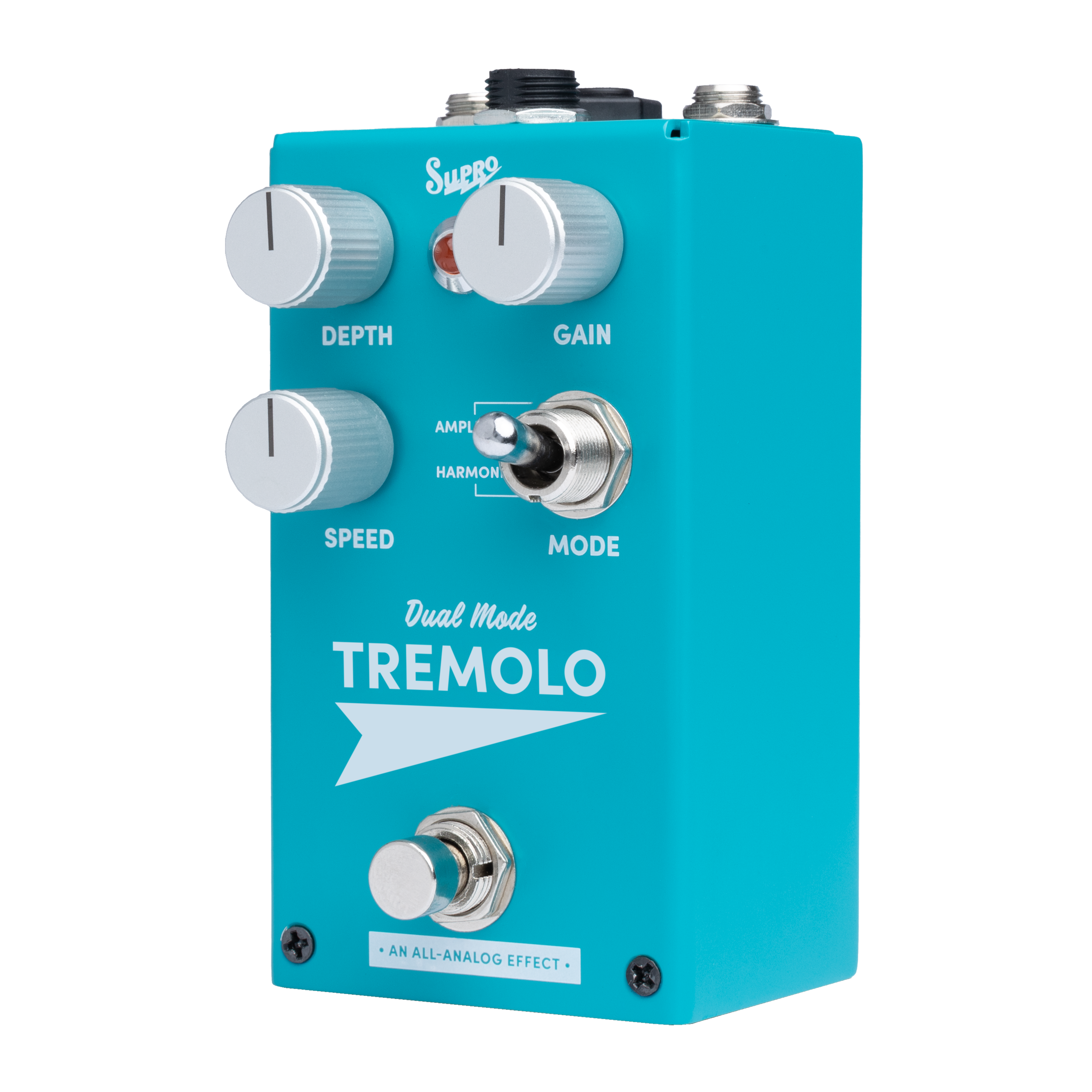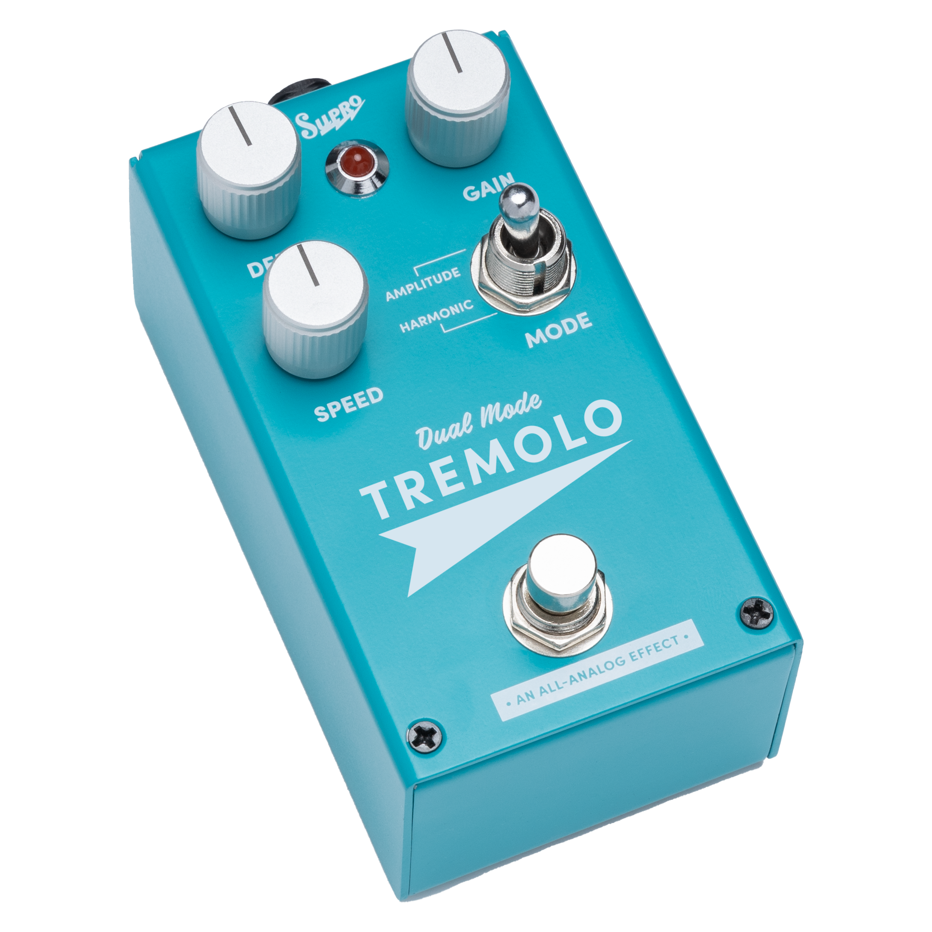 Le Supro Tremolo recrée fidèlement les effets de modulation emblématiques des amplificateurs américains des années 1960. Entièrement analogique, il propose deux modes distincts, Amplitude et Harmonic, pour passer d’un trémolo chaleureux et marécageux à des textures de modulation plus psychédéliques. Son circuit intègre des sections préampli et ampli de puissance, avec un véritable transformateur de sortie conçu pour reproduire la saturation magnétique caractéristique des amplis Supro historiques.