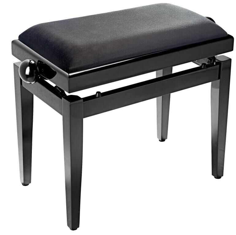 Banquette de piano, noir brillant, avec pelote en velours noir lisse