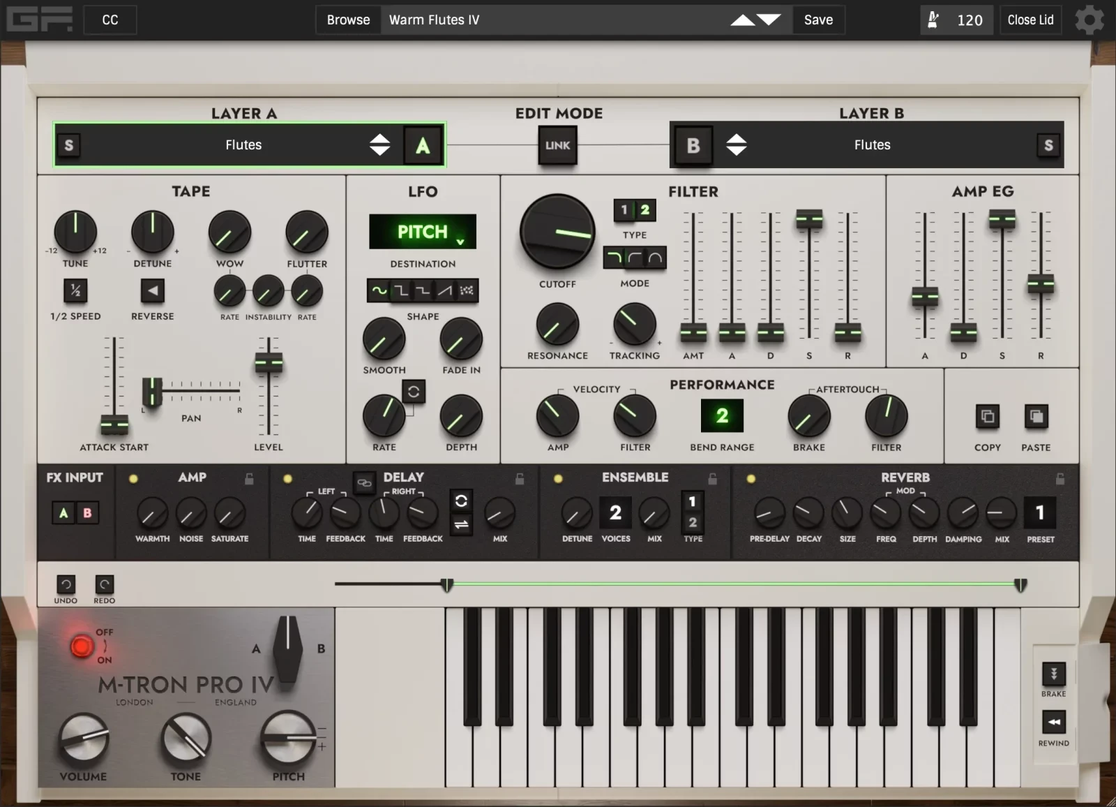 Le nouveau plugin d'instrument Mellotron est une recréation de la légendaire machine à échantillons de clavier à bande présente sur d'innombrables albums de rock classiques. Il est si emblématique que beaucoup le considèrent comme le premier échantillonneur. Forte de plus de 20 ans d'expérience dans le développement d'émulations de haute qualité, AIR vous assure que cet instrument ne vous décevra pas. Notre nouveau plugin d'instrument Mellotron est conçu pour la production musicale créative, avec une large gamme de paramètres, de réglages et de contrôles pour créer une vaste palette de sons d'instruments à clavier. Commencez avec les catégories de sons intégrées et explorez différentes sections de modelage sonore, notamment la nouvelle section "Flavor". AIR Mellotron comprend 6 ensembles de bandes comprenant les échantillons de bandes originaux de la flûte, du chœur et des cordes, ce qui lui confère un son véritablement authentique. Vous pouvez également sélectionner les versions "Dirty" et "Cleaned" des bandes originales. D'autres paramètres de modelage sonore incluent le Formant, l'Âge et le Point de départ de l'échantillon. Il y a 30 préréglages d'usine pour vous lancer, ainsi qu'une sélection d'effets intégrés, dont le nouveau AIR Flavour (pour une touche instantanée de lo-fi).