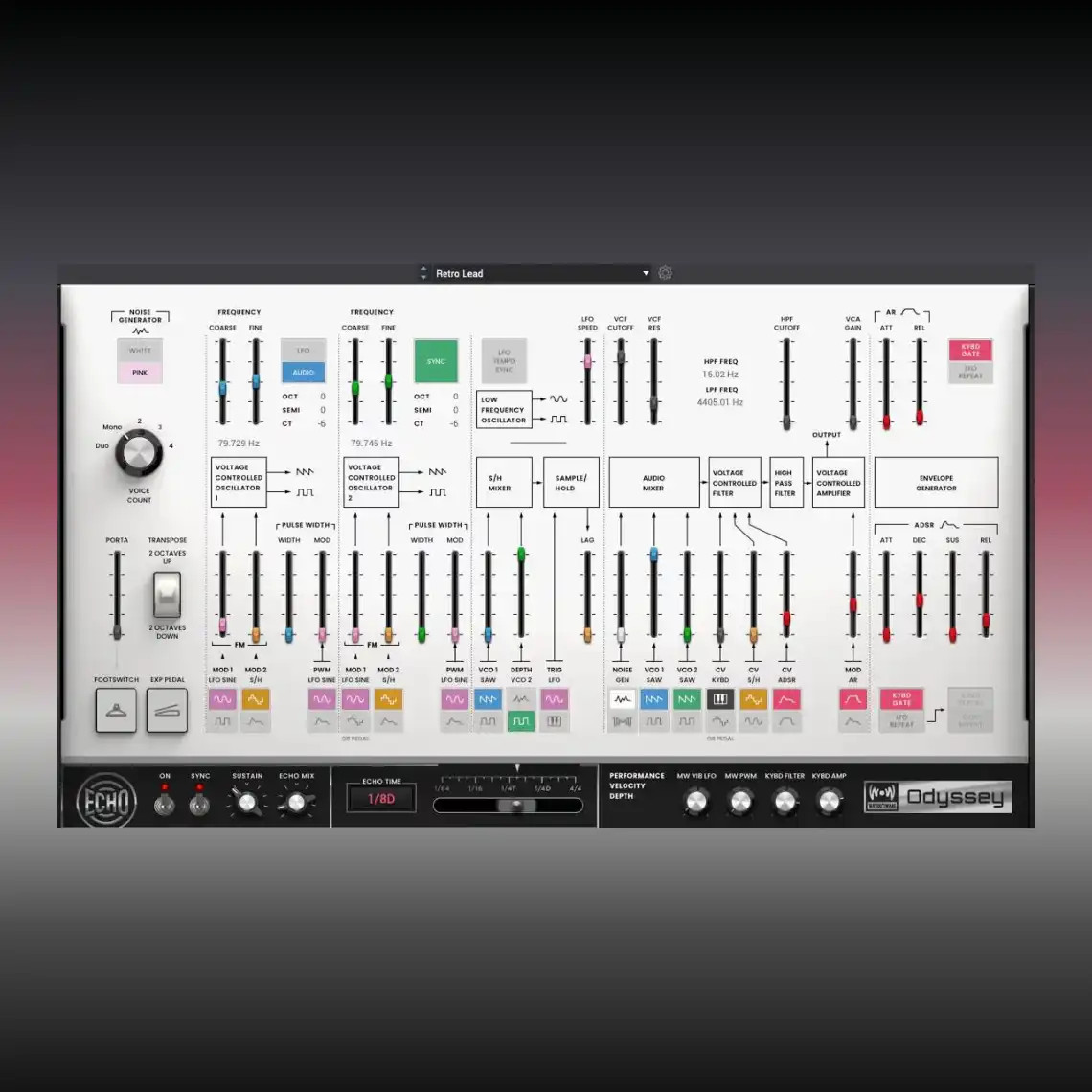 Développé par WayOutWare, les créateurs des légendaires instruments timeWARP2600 et Kick Axe. WayOutWare se distingue en créant des émulations d'une qualité supérieure. En réalité, TimeWARP était le seul produit d'émulation ARP 2600 approuvé par son créateur, Alan R. Pearlman. S'appuyant sur cet héritage d'excellence en matière d'émulation ARP, WayOutWare a créé une véritable reconstitution fidèle de ce synthétiseur légendaire. Non seulement il est fidèle du point de vue sonore, mais WayOutWare a également capturé le comportement, le caractère et le charme de l'ARP Odyssey d'origine grâce à leur expertise en modélisation de circuits et en traitement du signal. Chaque détail a été soigneusement étudié pour offrir une véritable expérience de réalisme, avec la possibilité de moduler l'expression à l'aide d'une pédale, de la vélocité et de la pression du canal. Façonnez votre son parfait en utilisant les puissants oscillateurs doubles, le LFO, le Sample and Hold, le Ring-mod, les filtres passe-haut et passe-bas. Puisez votre inspiration dans la bibliothèque intégrée et embarquez pour une véritable odyssée sonore de découvertes grâce à une infinie possibilité d'ajustements. Vous pouvez utiliser l'Odyssey en monophonique, en duophonique ou en synthétiseur polyphonique avec jusqu'à 4 voix simultanées pour élever votre projet vers de nouveaux sommets.