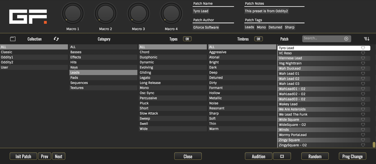 Oddity3 propose notre tout nouveau navigateur de presets qui vous donne le pouvoir d'organiser vos sons comme vous le souhaitez. Grâce à de nombreuses possibilités de balisage, de tri et de recherche, il est désormais rapide et facile de trouver les presets que vous voulez. Parlant de presets, nous en avons à profusion. Tout d'abord, nous avons inclus plus de 250 nouveaux presets créés par notre équipe de concepteurs sonores GForce, ainsi que par plusieurs synthétiseurs de renom. Vous pouvez également accéder à plus de 1750 presets hérités d'Oddity et Oddity2, tous classés et balisés pour une navigation aisée. Enfin, nous avons également inclus 66 presets fidèlement recréés à partir de livres de patches originaux. Avec un total de plus de 2000 presets à portée de main, l'inspiration est à quelques instants seulement.