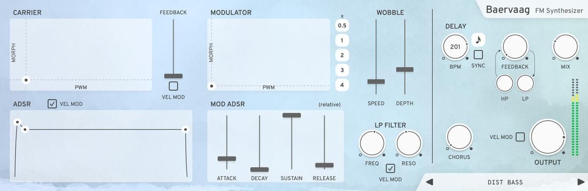 Baervaag est un synthétiseur FM assez simple avec un porteur et un modulateur. Les formes d'onde de l'oscillateur peuvent être modifiées en douceur, passant d'une onde sinusoïdale à une onde carrée pure grâce à la PWM (modulation de largeur d'impulsion).
