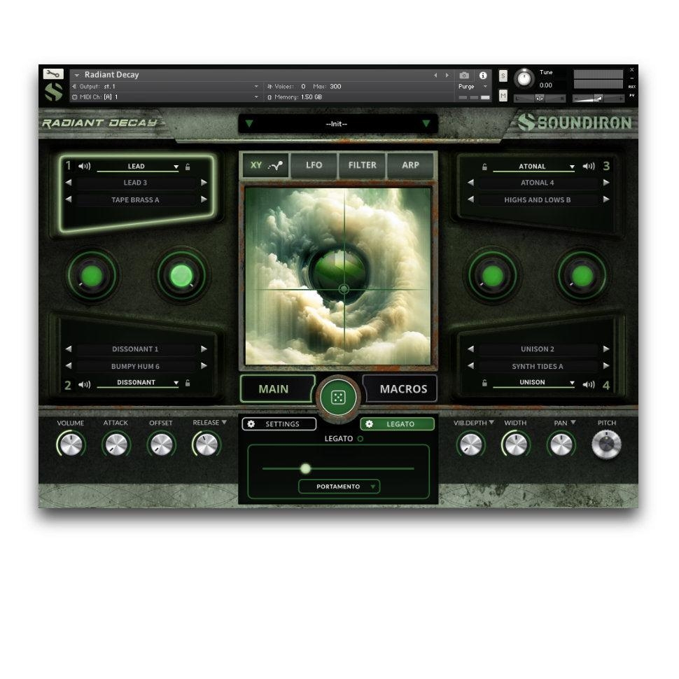 Vous pouvez mettre en place des arpégiateurs dynamiques, des glissandos et des motifs de strum avec notre système ARP intégré, offrant une gamme de possibilités telles que le rythme, la direction, le swing et la randomisation. La fonction Legato est également incluse, transformant instantanément cette machine en un instrument legato/portamento monophonique avec un contrôle ajustable de la vitesse de pliage de hauteur. Plongez-vous dans le réglage et l'automatisation de chaque paramètre avec un contrôle total sur chaque détail, ou appuyez simplement sur le bouton Random pour générer instantanément une variété infinie de nouvelles combinaisons de sons, de paramètres et de modulateurs dynamiques. Les boutons Macro à gauche et à droite du XY Pad peuvent être assignés pour moduler une variété de contrôles de mise en forme sonore de couche ou de plugins d'effets.