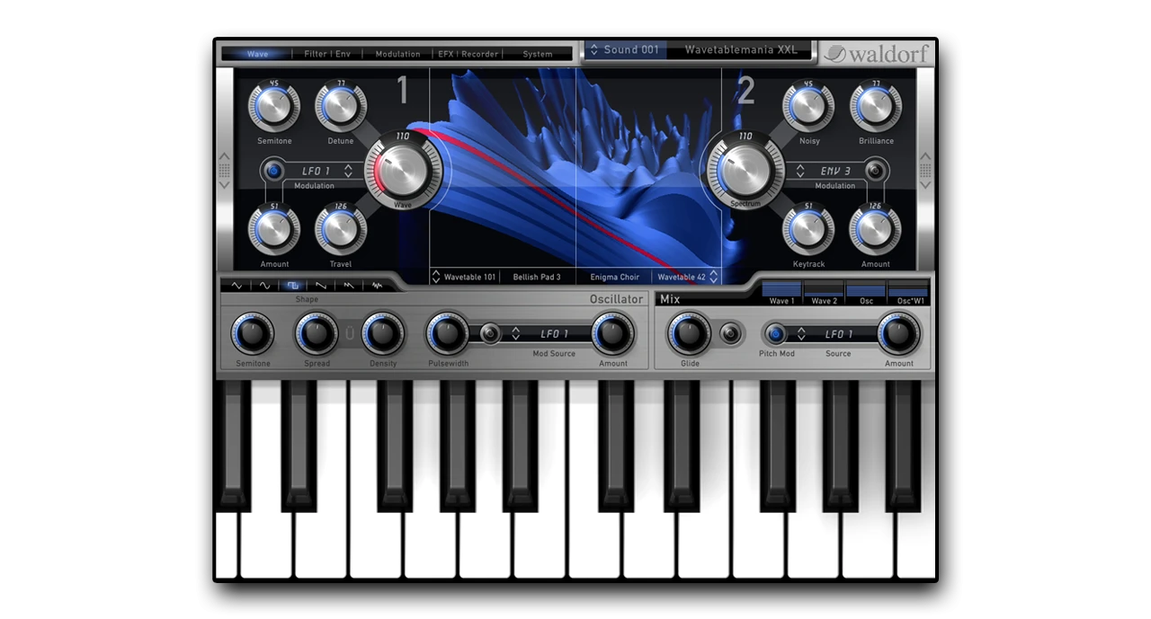 En tant que pur-sang des synthétiseurs, le Nave représente vraiment une aire de jeu phénoménale pour la créativité de la création sonore. Ses oscillateurs offrent une fonctionnalité de table d'ondes étendue avec des facilités d'édition élaborées et un synthétiseur de parole extrêmement efficace. Toute personne familiarisée avec les instruments logiciels de Waldorf se sentira immédiatement à l'aise avec le flux de travail typique de Waldorf, où les modules de façonnage sonore sont toujours directement accessibles et tous les contrôles de gestion de l'arpégiateur, des enveloppes, des effets et de la matrice de modulation ne sont qu'à un simple clic d'un bouton virtuel. Le Nave complète son clavier chromatique standard mais élégant avec des lames révolutionnaires et des pads pour contrôler le son de différentes manières.