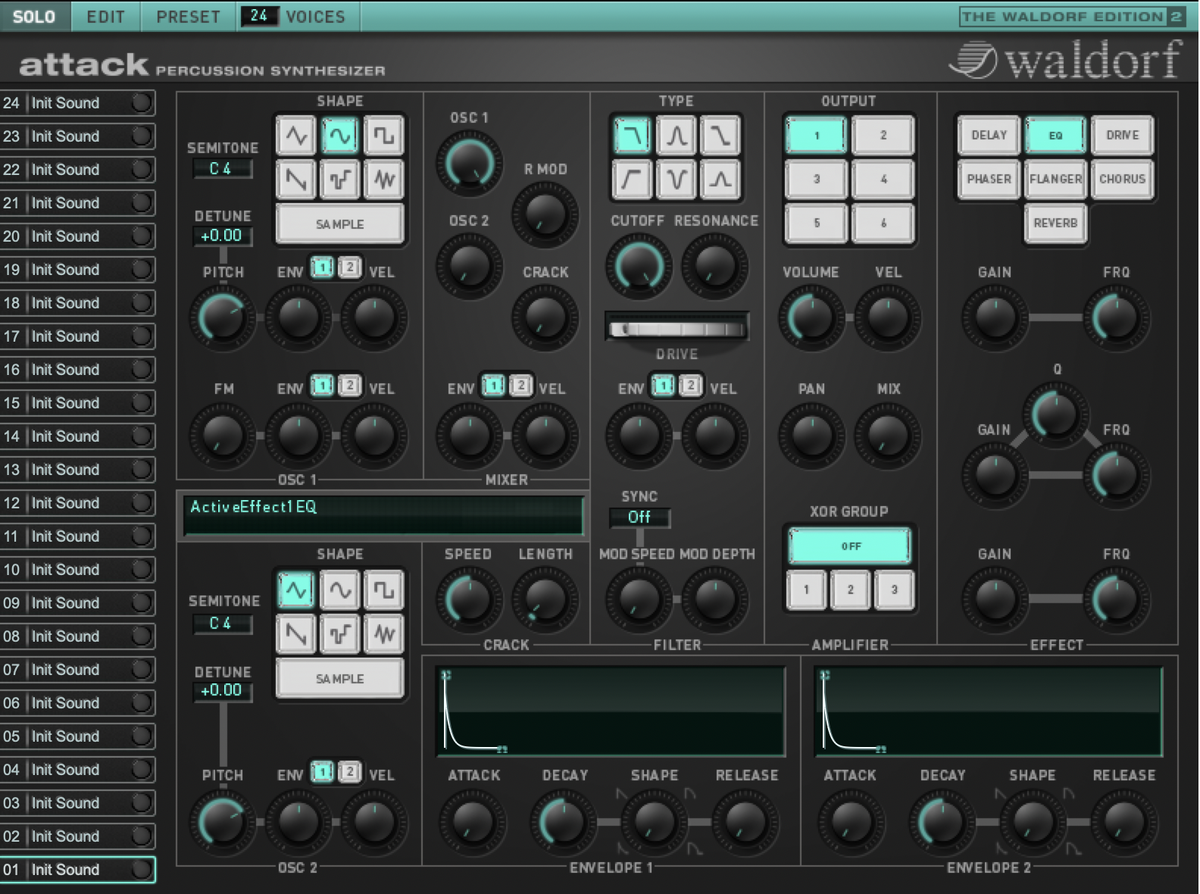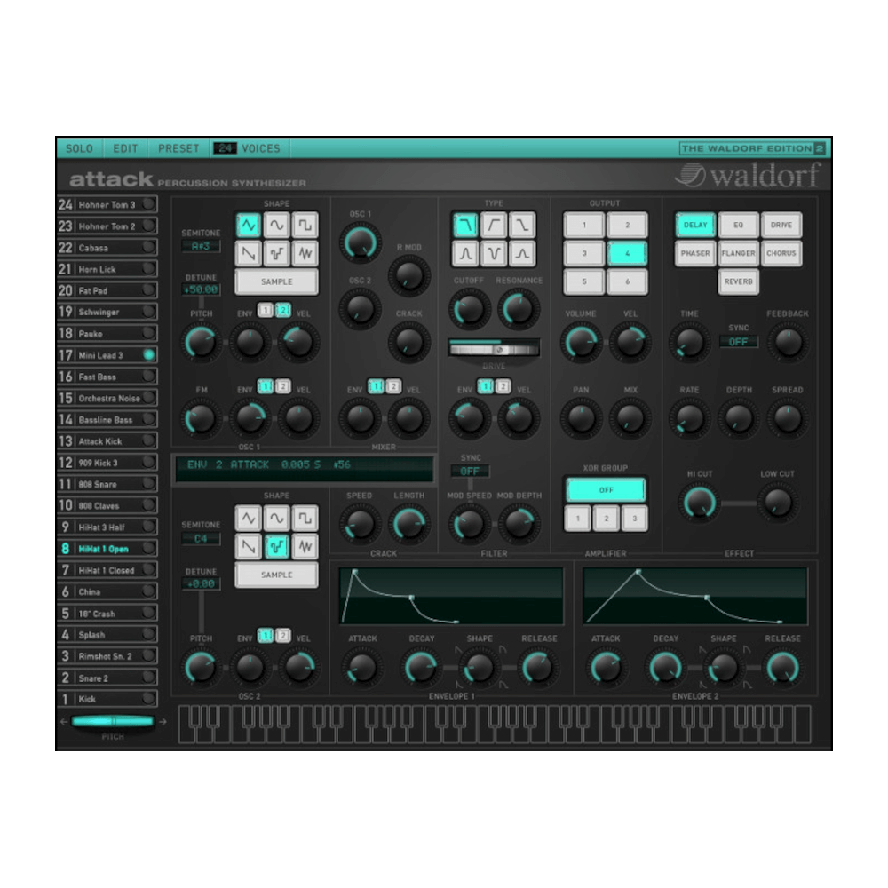 Tous les plug-ins ont maintenant une interface utilisateur complètement repensée. En plus de cela, 'Attack' contient désormais une section d'effets exceptionnellement étendue comprenant Delay, Equalizer, Drive, Phaser, Flanger, Chorus et Reverb.