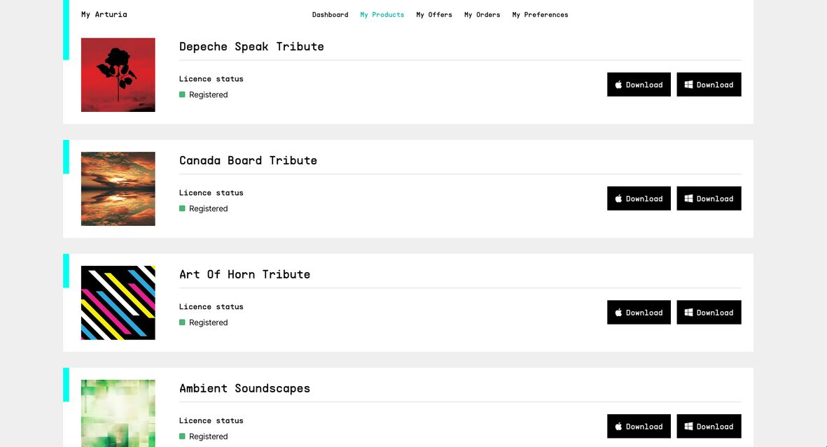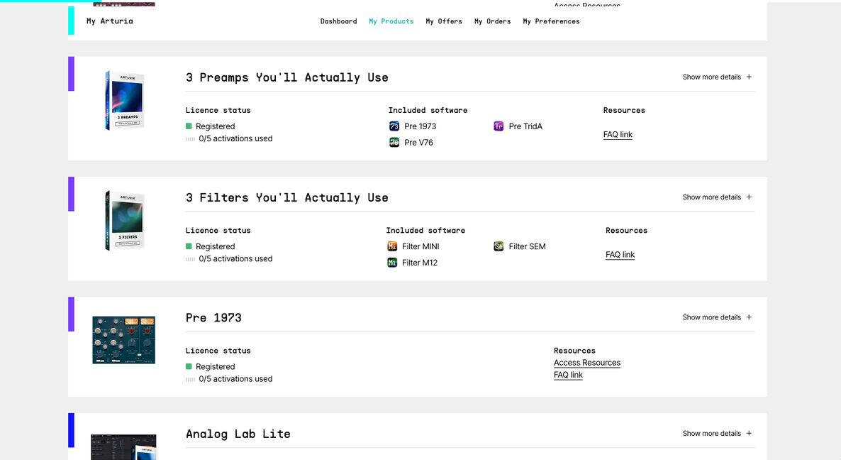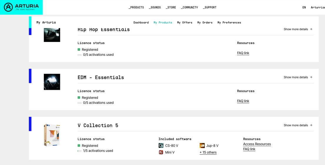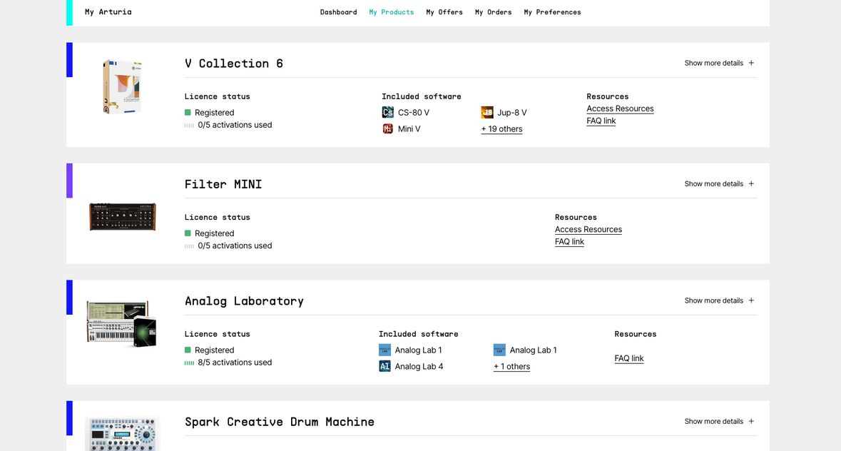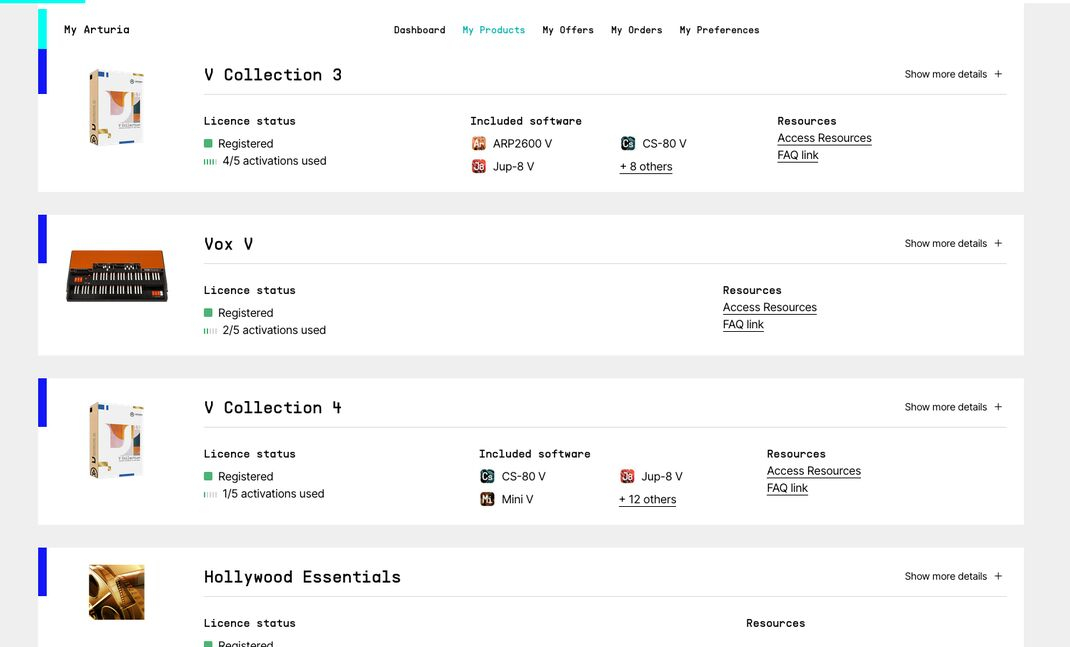 Je revends mon compte Arturia contenant pour 1000 $ de produits logiciels, incluant des synthés logiciels individuels, des extensions, des effets : compression et delays, des amplis, une boîte à rythmes et les bundles V Collection ; 3, 4, 5, 6 et 7 en licences individuelles (licences de bundles séparées, de sorte que chaque licence est individuelle en soi et peut être revendue comme licence individuelle), j’inclurai des captures d’écran de la page de mes produits dans mon compte Arturia. Pour plus d’infos, veuillez me contacter.
