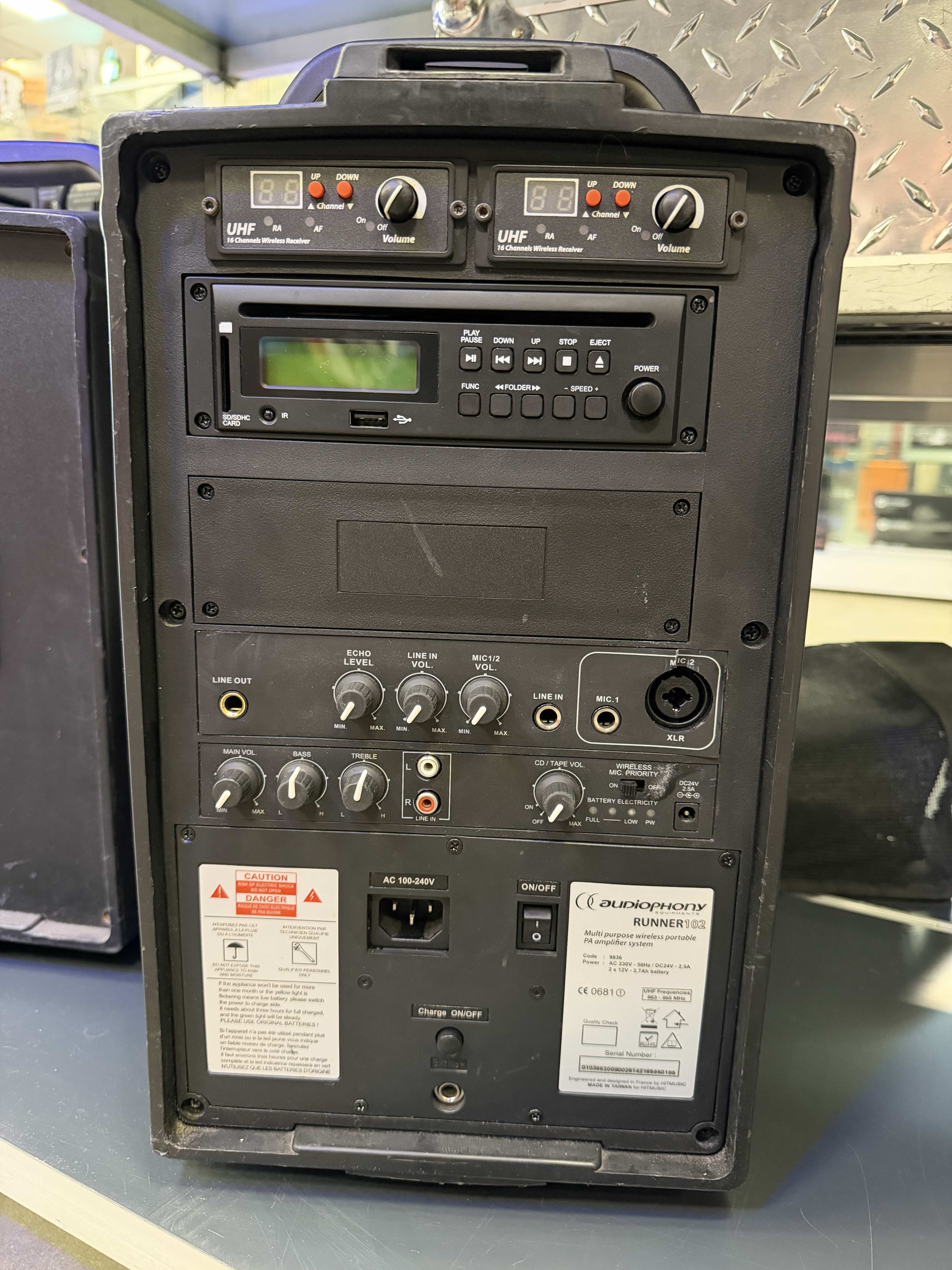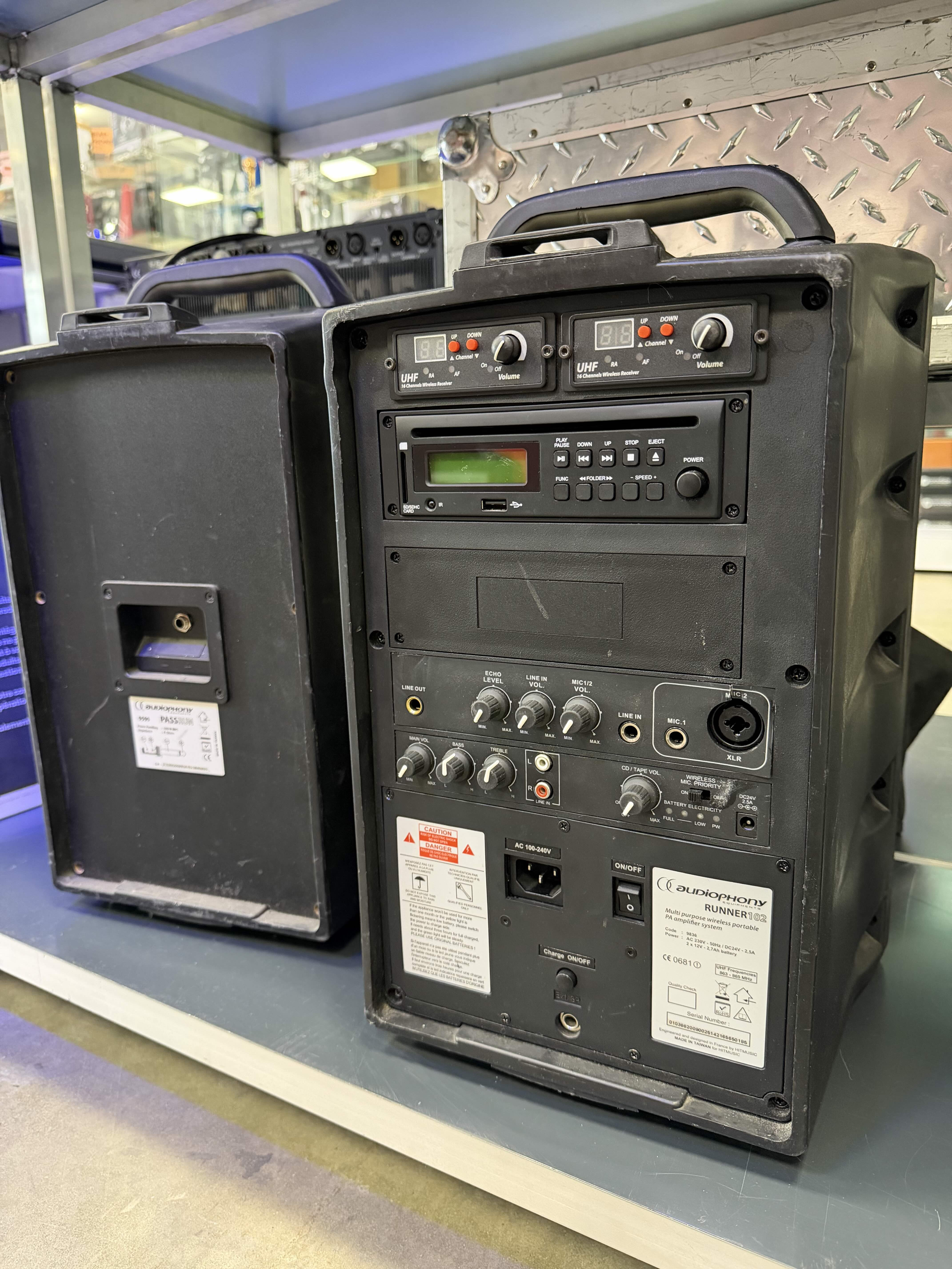 Ce pack Audiophony Runner 102 est une sono portable d’occasion, vérifiée, testée et nettoyée par notre technicien. Toutes les fonctions principales (ampli, lecteur, batteries, systèmes HF, entrées/sorties, liaison vers l’enceinte passive) ont été contrôlées pour garantir un fonctionnement fiable en déplacement.
