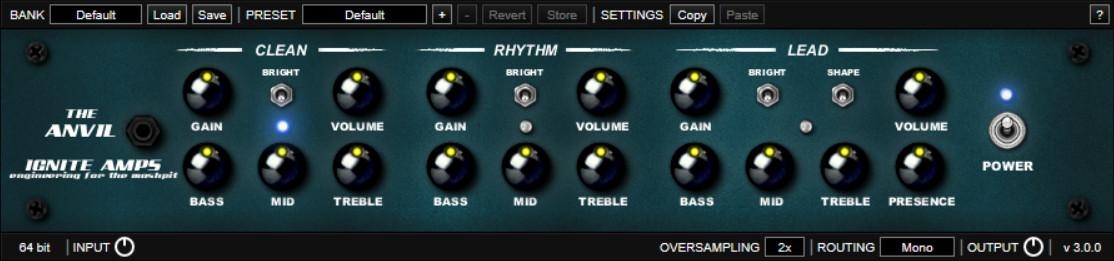 Le canal Lead fournit des tonalités métalliques ultra-serrées, conservant précision et réactivité même à des réglages de gain très élevés.Anvil est destiné à être utilisé comme préamplificateur de guitare pour jouer en direct et brouiller, suivre ou mixer à l'intérieur d'hôtes capables de prendre en charge les plug-ins VST, VST3 ou AU.